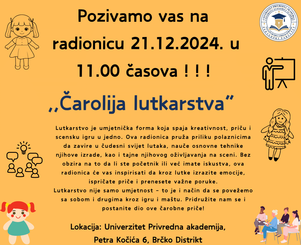 Poštovani gosti, bivši i sadašnji studenti, Univerzitet Privredna akademija organizuje radionicu u prostorijama univerziteta na temu lutkarstva 21.12.2024. godine u 11.00 časova.